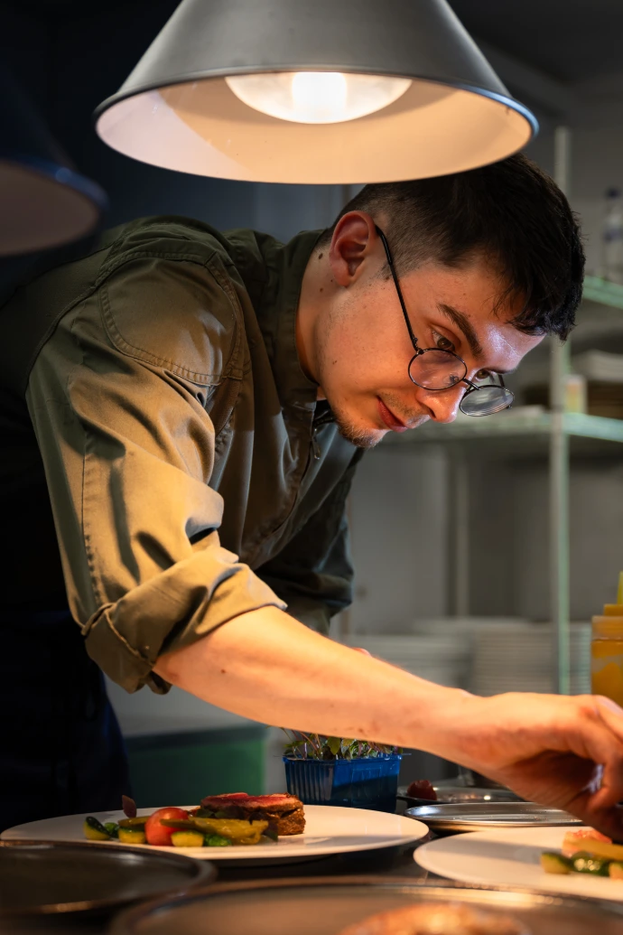 Passionné par les poissons et le végétal, il aime travailler des produits bruts, les comprendre et les respecter. Sa cuisine s’exprime dans les détails : des vinaigrettes, des tartares précis, des assaisonnements gourmands et pointilleux, toujours au service du produit.